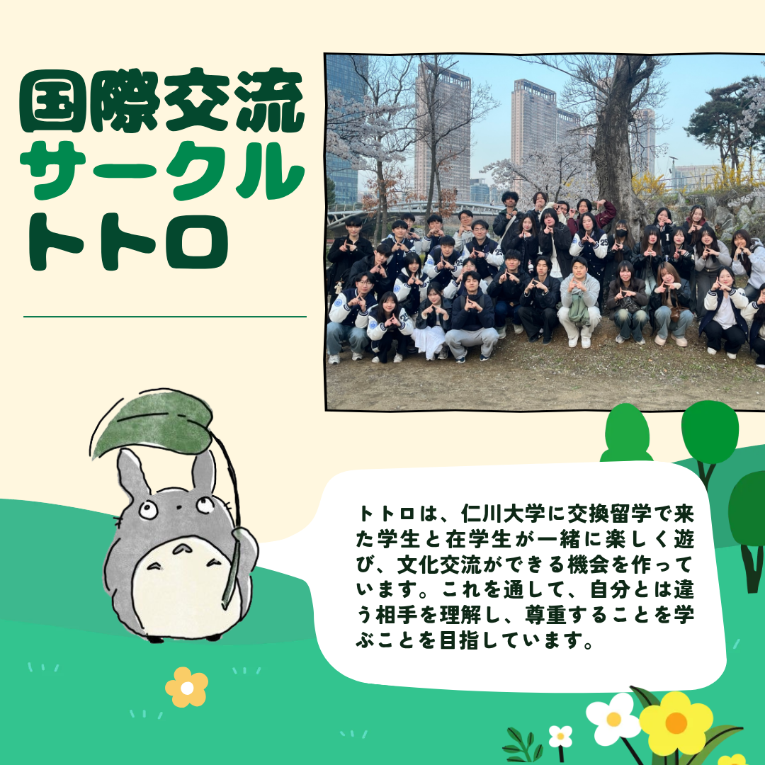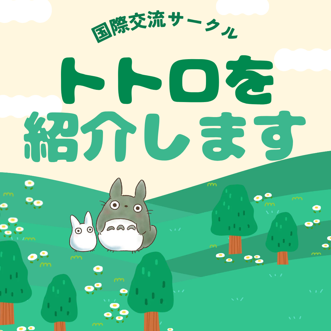 「トトロ」は、2016年に始まった日本地域文化学科の最も歴史の長い国際交流サークルです。学科の学生と交換留学生が一緒に交流しながら、お互いの言語や文化を分かち合い、自然に友達になれるよう、さまざまな活動を行っています。