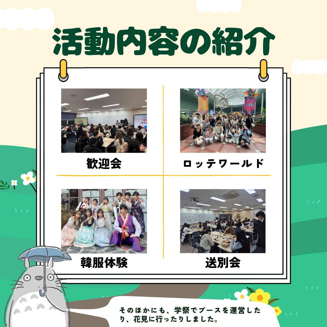「トトロ」では、体育大会や野球観戦、花見など、さまざまなイベントを企画し、学科の学生と留学生が自然に親睦を深め、文化交流ができるような機会を作っています。2025年には、学祭で日本の伝統遊びや衣装体験などを楽しめる日本文化体験ブースを運営しました。そのほかにも、花見、ロッテワールド訪問、韓服体験など、さまざまな活動を行いました。2026年も楽しく意味のある交流が続けられるよう、さまざまなプログラムを準備しています。